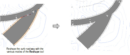 3 Use the Reshape tool to reshape the curb roadway as described in “Reshaping Objects” on page 1095. Roadway vertices can be repositioned, added, and deleted; however, the two control points that define the roadway cannot be reshaped. The Change Vertex mode of the Reshape tool can switch vertices to arc vertices to use curves in the curb roadway. The Hide or Show Edges mode of the Reshape tool can hide and show the portions of the curb where the roadway intersects with other roadway objects.