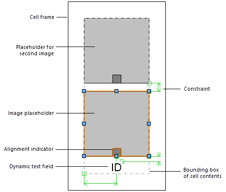 Edite o layout da célula para ajustar a exibição da imagem e, opcionalmente, adicionar campos de texto e geometria 2D.Você pode criar várias imagens no layout. Quando você adiciona ou reorganiza objetos no layout, o quadro da célula se ajusta automaticamente. O layout deve incluir o quadro e pelo menos uma imagem.