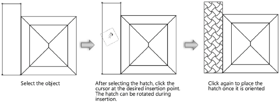 Quando você aplica a hachura a um objeto usando este método, a ponta da tinta que está escorrendo do balde (no ícone do cursor) marca o começo (ponto de inserção) do padrão de hachura. Esta marcação associada às dicas do cursor, permite posicionar a hachura no objeto com total precisão.