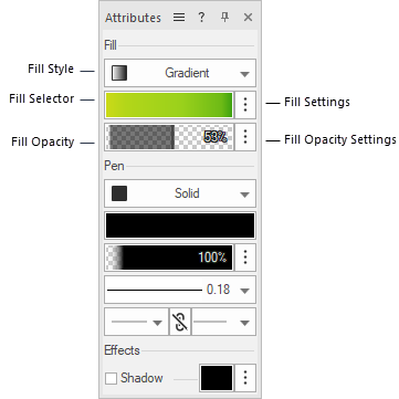 Somente recursos do tipo preenchimento podem ser aplicados a partir da paleta Atributos, não texturas ou materiais. Os componentes e objetos que usam um recurso material (é necessário o Design Suite) adotam automaticamente a configuração de preenchimento do material e substituem as configurações manuais e de atributo de classe para o preenchimento.
