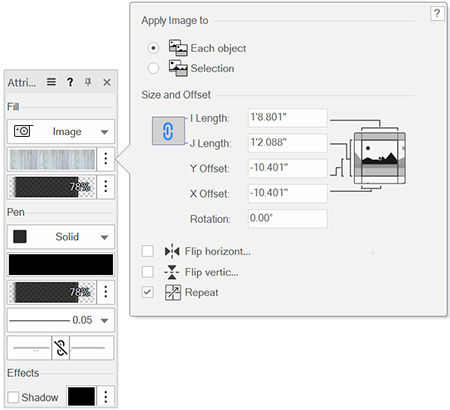 Depois que um preenchimento de imagem é aplicado a um objeto, o preenchimento pode ser personalizado para ser exibido conforme desejado para aquele objeto, sem afetar o recurso subjacente. Esta personalização pode ser feita usando o menu suspenso Configurações de Preenchimento na paleta Atributos ou a ferramenta Mapeamento de Atributos. Se o preenchimento de um objeto for editado com oMapeamento de Atributosferramenta, as alterações são refletidas no pop-over de configurações na paleta Atributos. Por outro lado, as edições feitas na paleta Atributos são refletidas no objeto de edição da ferramenta de mapeamento.