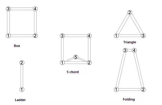 Attach a Truss Chord Info record to each snapping polygon. Each record has a Chord Width record field (in document units) and a Chord ID record field. The Chord ID value must be unique for each truss; the diagram below shows how various truss types have been numbered according to Vectorworks' standards.