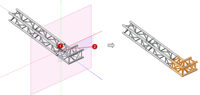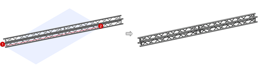 When you add a truss to another truss or a truss line, it is automatically inserted at the same hanging angle as the existing system, even if a different placement mode or hanging angle is specified. Depending on the resource selected, the added truss may be a straight, curved (or circular), hinge, or corner element.