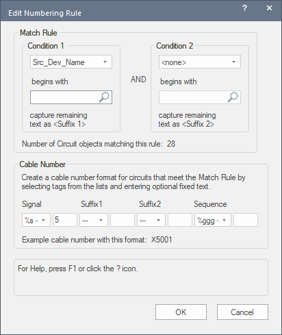 The matching criteria consist of two conditions. Both conditions must be met for the rule to be considered a match, and for the cable number format to be applied to the circuits.