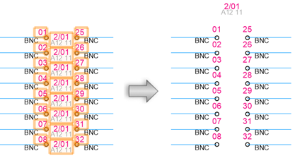 Typically, ConnectCAD represents panels (jackfields, terminal panels, connector panels, etc.) as a separate connector device, each with the same name and one socket. This allows you to place these devices in different locations on the schematic to illustrate the signal flow. However, it can be convenient to combine these devices into a single device with multiple sockets. These commands switch between single and multiple device representations.