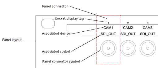The panel connector displays a connector symbol and its label, to represent the schematic device and socket that the connector is linked to. The Panel Connector tool adds panel connectors to panel layouts (see Creating connector panel layouts).