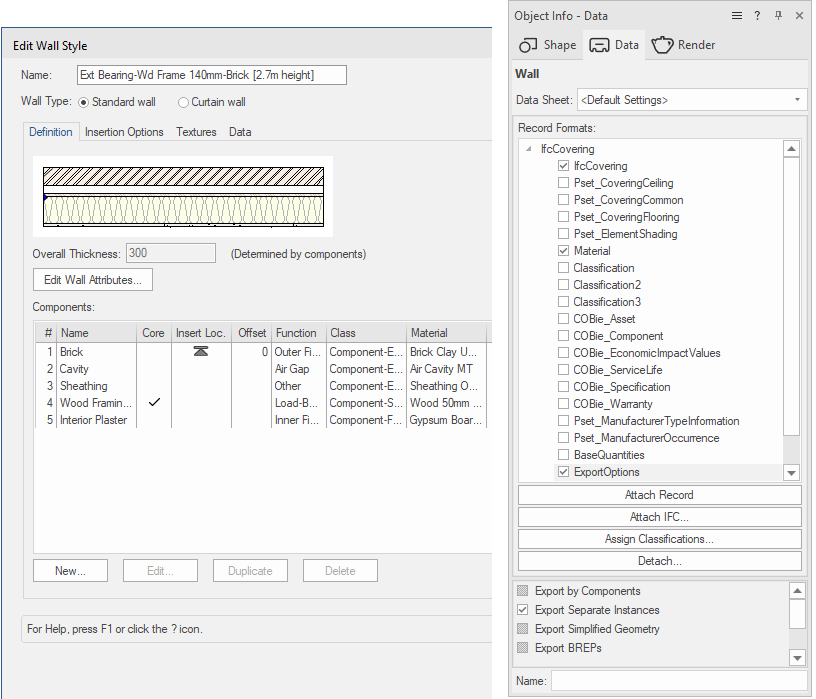As condições podem ser usadas ao exportar um único objeto como entidades separadas. Aqui temos uma parede com vários componentes. Usando o campo Função do estilo de parede, uma entidade IFC diferente pode ser mapeada para cada componente durante a exportação.