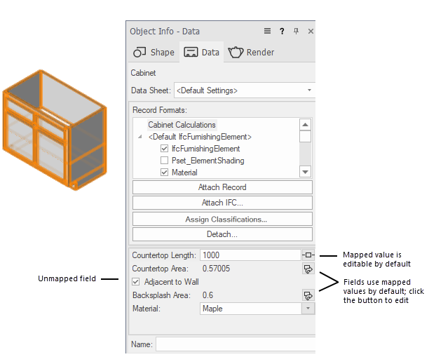 Quando um gabinete é colocado no desenho, a guia Dados da paleta Informações do objeto mostra que os dados do registro foram anexados automaticamente. Para cada campo mapeado, a configuração na coluna Editando (