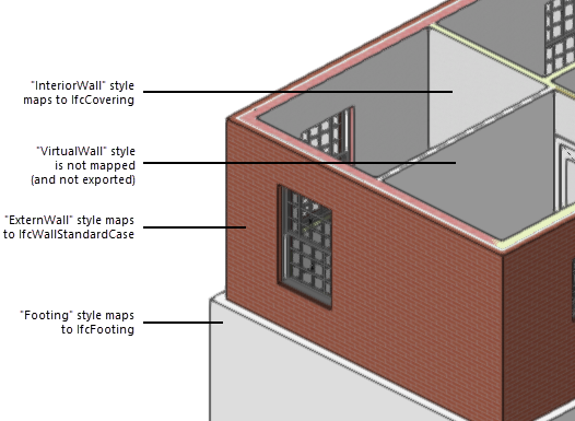 O arquivo exportado conterá paredes com uma das três entidades IFC, dependendo do estilo da parede. As paredes com o estilo de parede VirtualWall não são mapeadas para nada e não serão exportadas.
