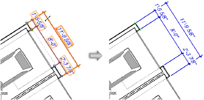 Se a cota possuir vários valores de sobreposição para deslocamento ou comprimento, cada linha de chamada terá sua própria linha tracejada para edição.
