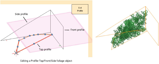 For any of the Profile configurations, opens a profile editing mode. Select the profile object to edit, and use the polyline editing tools as needed. Click Exit Profile to close editing mode and update the foliage object.