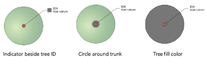 The symbols for retained and removed trees are scaled by the canopy height and diameter specified from the Object Info palette. The original and proposed symbols for a transplanted tree are scaled by the DBH parameter.