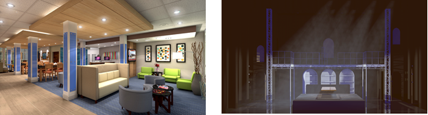 Como a renderização dá uma aparência sólida aos objetos 3D, para criar uma renderização, você deve ter um modelo 3D, não apenas um plano 2D ou uma coleção de objetos planares. O Vectorworks oferece muitos plug-ins de objetos e símbolos que incorporam componentes 2D e 3D, para que funcionem igualmente bem nas visualizações Topo/Planta e 3D. Muitos desses objetos, como objetos de construção, plantas, objetos de design de entretenimento e móveis, requerem um produto Design Suite. Você também pode criar objetos 3D personalizados.
