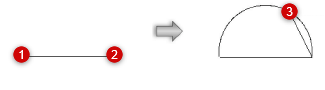 Sem a tecla Shift, o ângulo da linha entre os pontos finais (cliques 1 e 2) não é restrito, e a corda que define a altura do arco é uma linha não restrita desenhada a partir do segundo ponto final.