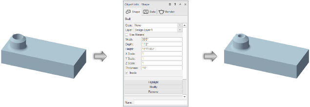 SelecioneEditar recursosno menu de contexto, realce uma face da concha e selecioneModificar Sólido com espessurasno menu de contexto. Altere a espessura do objeto na barra de ferramentas.