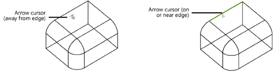 A seleção de face também pode ser baseada em bordas. Quando o cursor estiver em uma borda ou perto dela ou perto de uma curva isoparamétrica, você poderá selecionar a face de qualquer um dos lados da borda dependendo da posição do cursor. O destaque de face ajuda a determinar qual face será selecionada.