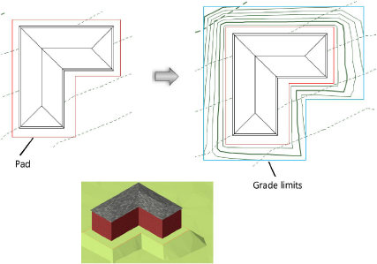 Because grade limits are often associated with a planar pad or other type of site modifier, the Vectorworks Landmark and Architect products can create grade limits automatically around a site modifier, based on specific parameters. Grade limits can be created with a gradual sloping transition from the existing site contours to the modifier, placed at a variable or fixed distance from the modifier. The grade limits cut and fill the site model to create a constant slope (batter slope).