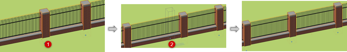 In Post mode, moves posts along the fence line, depending on spacing and style settings. The position of posts with panels is determined by the panel.