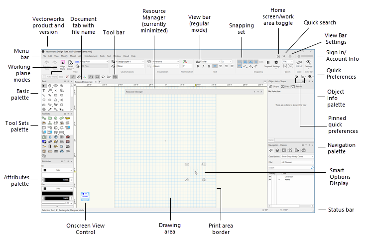 Cada produto Vectorworks possui um workspace exclusivo que contém os menus, paletas e conjuntos de ferramentas apropriados para aquele produto em um layout padrão (veja Conceito: Workspaces). Ao trabalhar no aplicativo, as paletas podem ser exibidas, escondidas e movimentadas conforme necessário. Ao fechar o aplicativo, as configurações são preservadas e utilizadas na próxima inicialização.