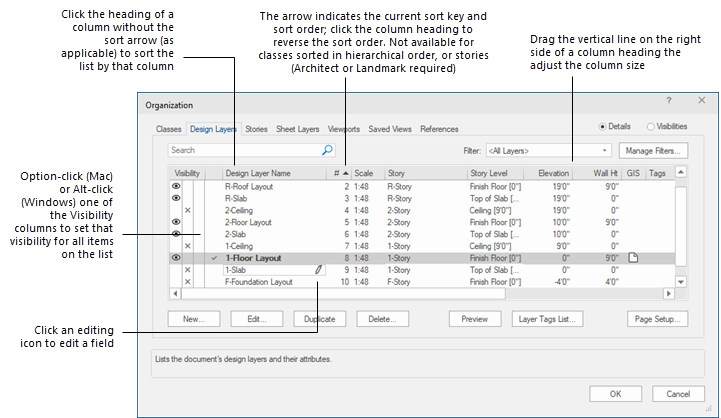 Para habilitar a exibição hierárquica na guia Classes da janela de diálogo Organização e na paleta Navegação (é necessário o Vectorworks Design Suite), veja Exibindo classes em ordem hierárquica .