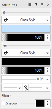 Para controlar os atributos de muitos objetos, ou componentes/partes de objetos, de uma só vez, os atributos podem ser definidos pelas configurações de classe.As propriedades de classe podem ser atribuídas a um objeto no momento da criação ou posteriormente.A paleta de Atributos é exibida com uma seta curva para os atributos que são definidos pela classe.