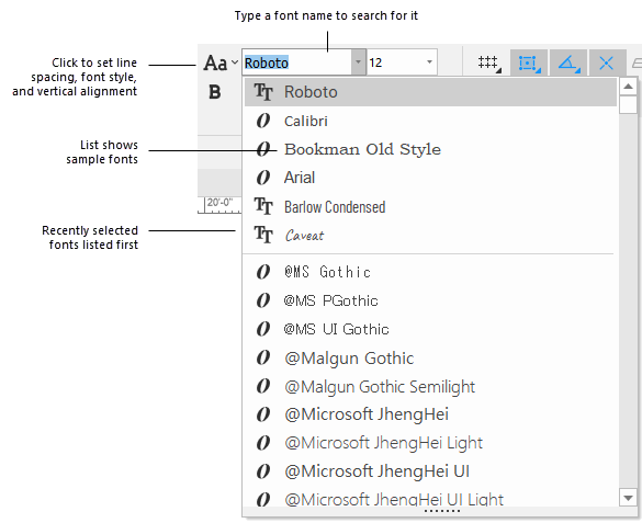 As fontes usadas recentemente são armazenadas para acesso rápido. Quando você seleciona o comando, as oito fontes usadas mais recentemente são exibidas no topo da lista de fontes (com a fonte mais recente listada primeiro), seguidas por uma lista em ordem alfabética de todas as fontes disponíveis.