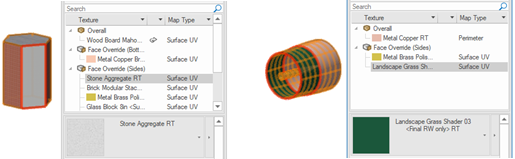 O navegador de textura na aba Renderizar da paleta Info de Objeto exibe as texturas aplicadas a objetos 3D, como sólidos, superfícies NURBS, malhas, polígonos 3D e assim por diante. Alguns tipos de objetos suportam texturas apenas no objeto geral, enquanto outros suportam texturas e mapeamento em faces individuais; o navegador de textura identifica as texturas nas faces como uma substituição da textura geral (veja Objetos com suporte para a ferramenta Textura). Alguns tipos de objetos que suportam texturas em faces individuais distinguem entre as faces superior/inferior e os lados, enquanto outros agrupam todas as faces juntas. Cada entidade no navegador de textura pode ser editada independentemente das outras. Veja Gerenciando texturas de objetos a partir da paleta Info de Objeto para obter informações sobre as operações que podem ser concluídas no navegador de textura.