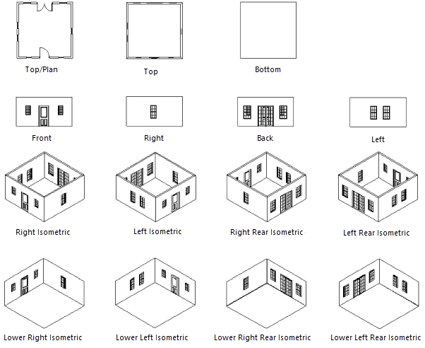 Vectorworks provides several standard views, which change the representation and the orientation of the drawing area, so you can easily view the model from a variety of different angles. The standard view options can be divided into four basic categories: