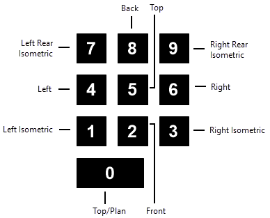 The numeric keypad shortcuts for several standard views are shown below. These shortcuts also change the view of a selected viewport on a sheet layer.