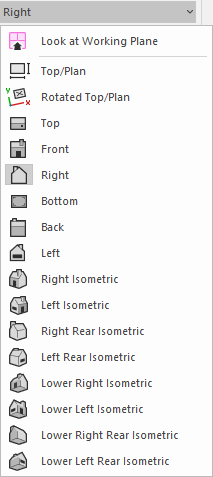 The View bar indicates the current view, and provides quick access to the standard view commands. The Look at Working Plane option is also available, to align the view to be perpendicular to the working plane.