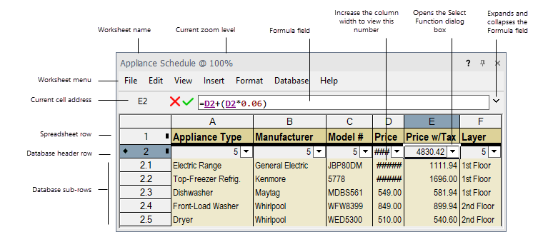 As planilhas podem ter dois tipos de linhas: planilha e banco de dados. As células em uma linha da planilha contêm constantes (texto ou números) ou fórmulas. As linhas do banco de dados consistem em uma linha de cabeçalho e sublinhas e mostram dados associados a objetos de desenho específicos. Defina os critérios de seleção para a linha do cabeçalho e uma sublinha será criada para cada objeto que atenda aos critérios.